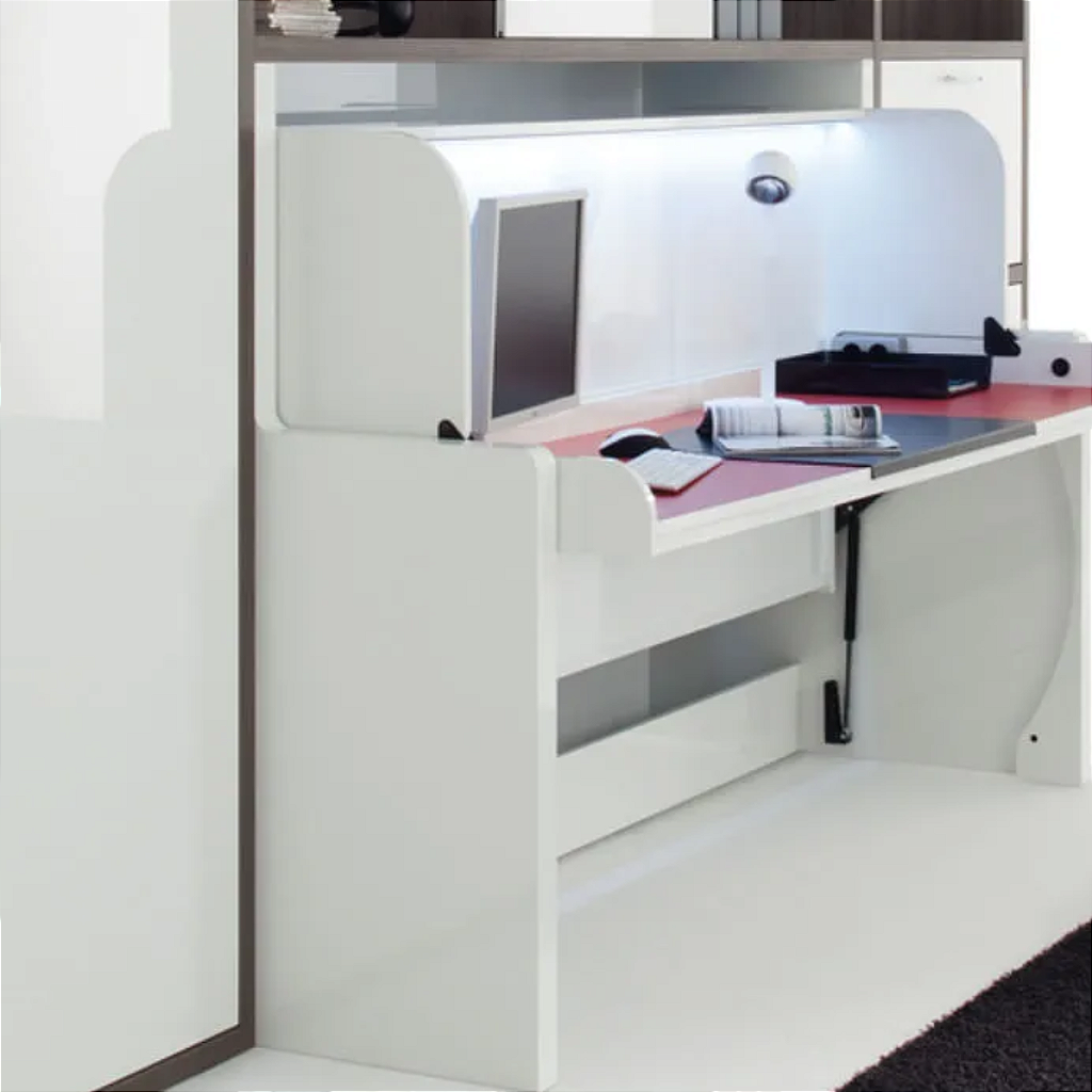 Com aplicação flexível, o Tavolleto pode ser adaptado para criar uma cama com armários modulares ao redor, aproveitando ainda mais o espaço disponível. Ele é perfeito para ambientes residenciais compactos, como quartos de hóspedes ou até mesmo motorhomes, hotéis e hospitais. Com esse sistema inteligente, você otimiza seu ambiente e mantém a funcionalidade sem perder o design moderno.